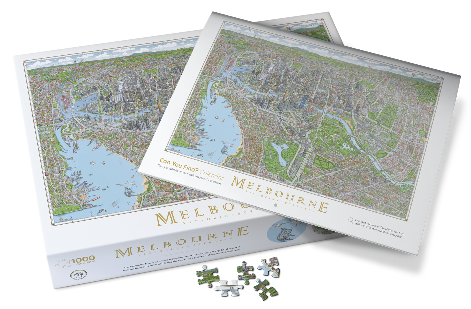 Pre-order your Melbourne Map 1000 piece jigsaw puzzle and Can You Find? Calendar today.